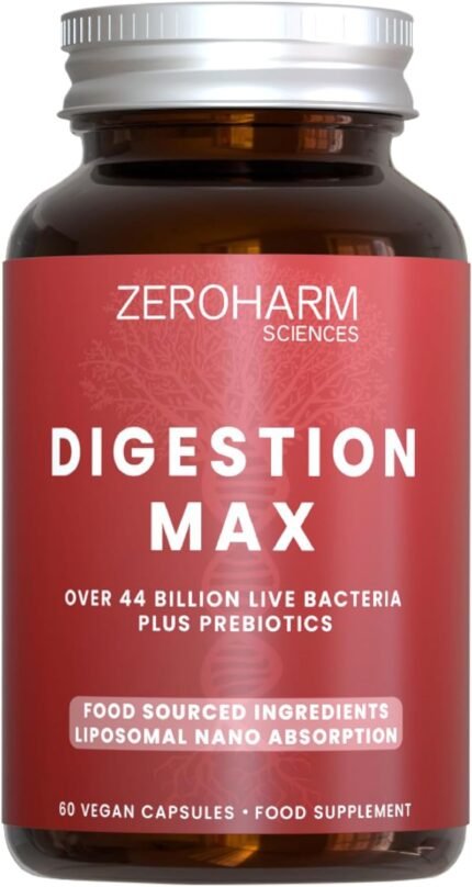 ZeroHarm Digestion Max – 44 Billion CFU Probiotic with 11 Strains & Prebiotics – Gut, Bowel & Digestive Support – Powered by Real Food Ingredients – 60 Vegan Capsules