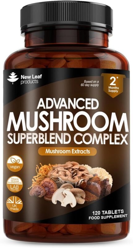 Mushroom Complex – Lions Mane + Cordyceps Chaga Reishi Shiitak,Maitake Mushroomss Blend – High Potency Supplement – Made in The UK – 120 Tablets