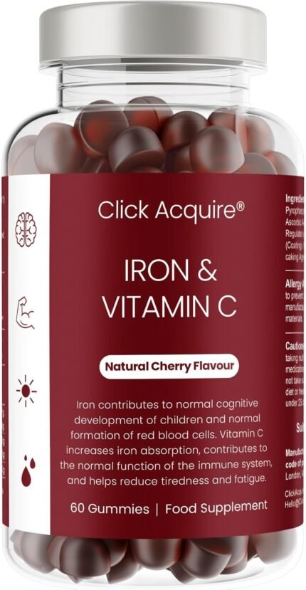 Iron and Vitamin C Gummies for Kids & Adults | 7mg Gentle Iron, 20mg Vitamin C Chewable | Vegan Natural Cherry Flavour | 2 Month Supply
