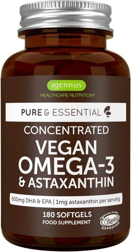 Igennus Vegan DHA & EPA Omega 3 90 Servings,1344mg Algae Oil & Astaxanthin Antioxidant, Pure & Sustainable, 400mg DHA & 200mg EPA, Easy-to-Swallow, 180 Small Softgels