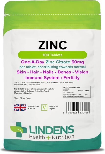 Lindens Zinc Citrate 50mg – 100 Vegan Tablets – Immune Function, Fertility, Healthy Bones, Vision, Hair, Nails and Skin – Made in The UK | (3+ Months Supply) | Letterbox Friendly