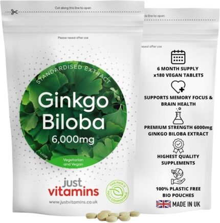 Ginkgo Biloba High Strength 6000mg | 180 Vegan Tablets | Supports Memory, Focus & Circulation | Brain Health & Cognitive Function | Non-GMO | UK Made – Just Vitamins