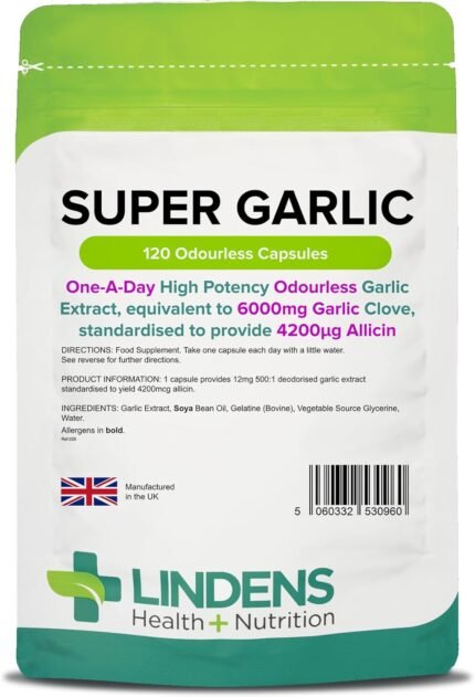 Lindens – Super Garlic 6000mg High Strength – 120 ‘1-A-Day’ Capsules – UK Made – High Potency Odourless Garlic Extract – Equivalent to 6000mg Garlic Clove, Standardised to Provide 4200μg Allicin.