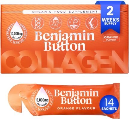 14x Marine Collagen Liquid Sachets – 10,000mg Hydrolysed Type 1 with Vitamin C | Skin, Hair, Nails | Orange Flavor | 2-Week Supply | Higher Absorption vs. Powder/Tablets – Benjamin Button®