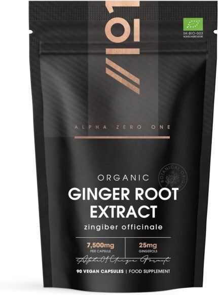 Organic Ginger Extract 7500mg – Standardised 5% Gingerols (25mg) – 90 Vegan Capsules (3 Months Supply) – Resealable and Recyclable Pouch by Alpha01