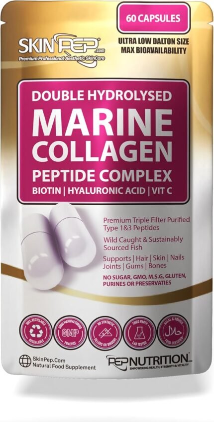 Marine Collagen Pure 100% (60 Capsules) Type 1 Hydrolysed Collagen Peptides Enhanced with Hyaluronic Acid & Vitamin C -Essential Amino Acids – Collagen Supplements for Women and Men by SkinPep