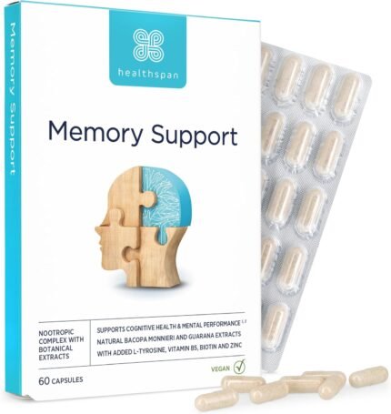 Healthspan Memory Support (60 Capsules) | Supports Your Concentration, Memory and Cognitive Health | Biotin and Zinc | Bacopa Monnieri Extract and Guarana for Alertness | Vegan