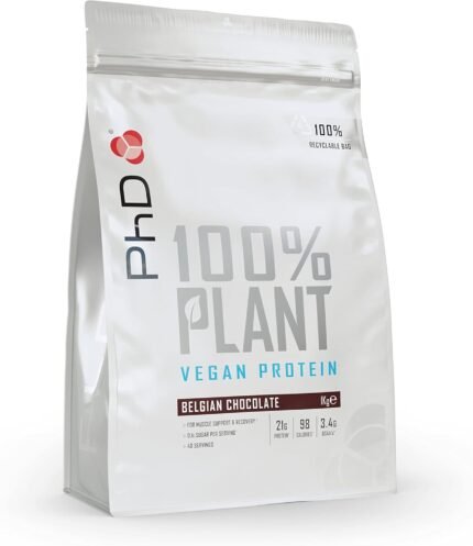 PhD Nutrition 100 Percent Plant Vegan Protein Powder, Rich in BCAA and Low Calorie, Belgian Chocolate, 21g of Plant Based Protein, 40 Servings per 1 kg Bag