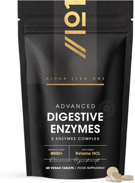 Digestive Enzyme Complex 4000 U with Betaine HCL – 60 Vegan Tablets – Potent 5 Figestive Enzymes Complex – Resealable and Recyclable Pouch by Alpha01