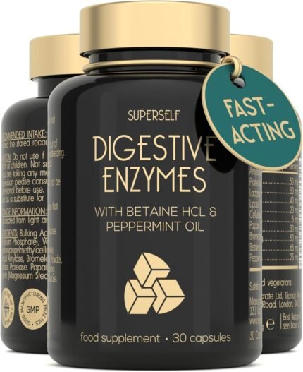 Digestive Enzyme Supplements with Betaine HCL – 7 Digestive Enzymes for Gut Health & Support with Lactase, Bromelain, Lipase & Peppermint Oil – 30 Capsules – Gentle & Fast Acting Tablets – UK Made