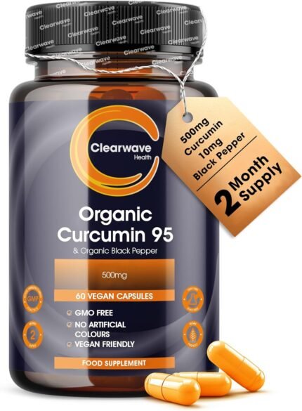 Curcumin 95 | Organic | Curcumin Capsules high Strength with Black Pepper | 500mg 95% Curcuminoids & 10mg Organic Black Pepper | 60 Capsules 2 Month Supply | by Clearwave Health