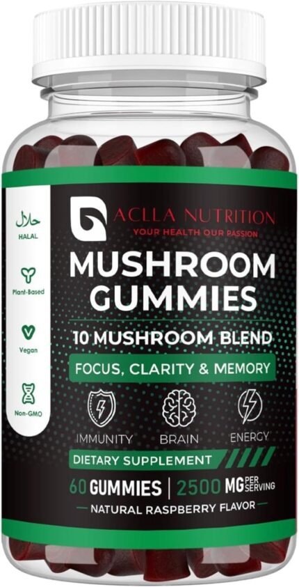 Aclla Mushroom Gummies with Shilajit – 10-in-1 Complex with Lion’s Mane, Reishi, Chaga & More – 2500mg – Brain, Energy & Immune Support – Vegan, Low Sugar, Non-GMO – 60 Raspberry Flavour