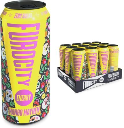 Furocity Sugar Free Energy Drink, Mango Mayhem, 157mg Caffeine, Low Calorie, Zero Sugar, High in Vitamins C, B6, B12, Taurine, Vegan, 12 x 500ml Cans