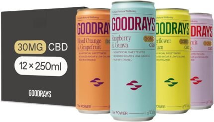 GOODRAYS CBD Drinks, Sparkling Low Calorie Soft Drink, Natural Sleep Stress and Anxiety Relief, Vegan, 4 Flavour Mixed Pack, 12 x 250ml Cans, Packaging May Vary