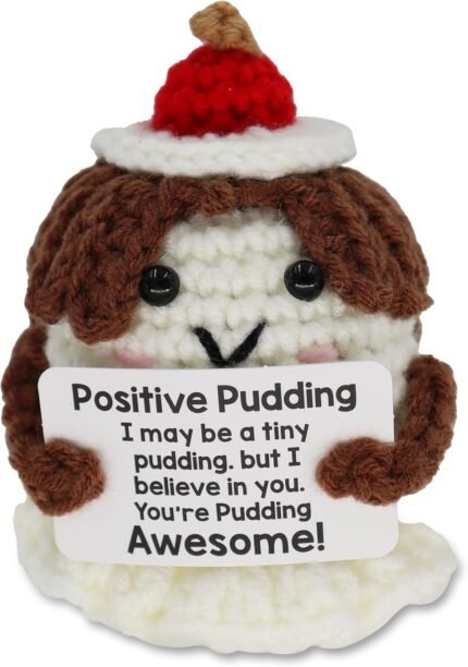 Pocket Hug Positive Caramel Pudding Plush – Handmade Crochet Stress Relief Doll with Motivational Card, Cute Emotional Support Gift for Boys and Girls, Friends, Coworkers, Anxiety Relief