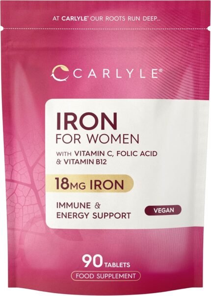 Iron Tablets 18mg | High Strength for Women | with Vitamin B12, Vitamin C and Folic Acid | 100% NRV Iron Complex | 90 Vegan Tablets | by Carlyle