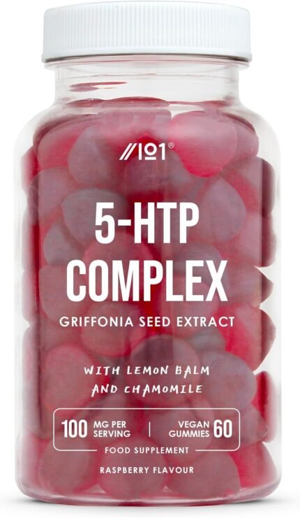 5-HTP Gummies – Bedtime Gummies with Chamomile & Lemon Balm Extracts, Raspberry Flavour – 60 Gummies. 1 Pack