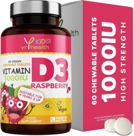 Kids Vitamin D3 1000 iu High Strength – Chewable Raspberry Flavour Vitamin D for Kids 4-12 Years, Vegan Society Registered Tablets not Gummies – 2 Months Supply – Made in The UK by YrHealth