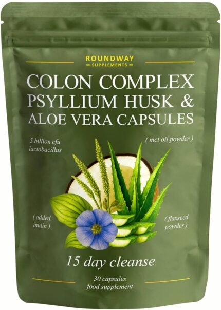 Colon Cleanse | 15 Day Detox with Psyllium Husk, Aloe Vera, Acidophilus Probiotic, Flaxseed Powder, MCT Oil, 30 Capsules | Colon Complex Made in The UK by Roundway Supplements