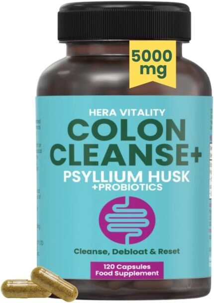 Colon Cleanse Psyllium Husk & Probiotics | Gentle Digestive Support for Constipation, Bloating Relief & Gut Health | 120 Vegan Capsules HERA VITALITY