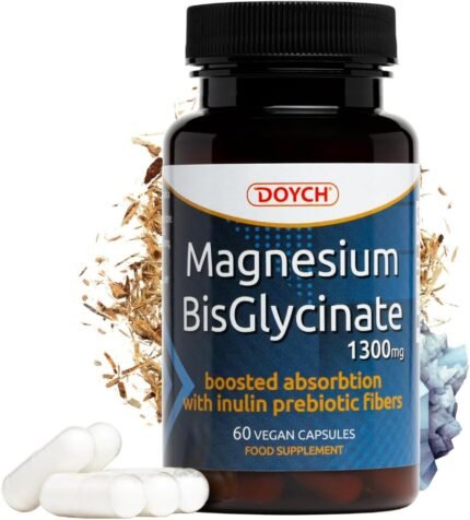 Magnesium Bisglycinate Capsules 1300 mg with Inulin Prebiotic Fibers Boosted Absobtion – No Fillers – 156 mg Elemental Magnesium Glycinate Supplements – No Cramps – Sleep Support – 2 caps. Daily Doych