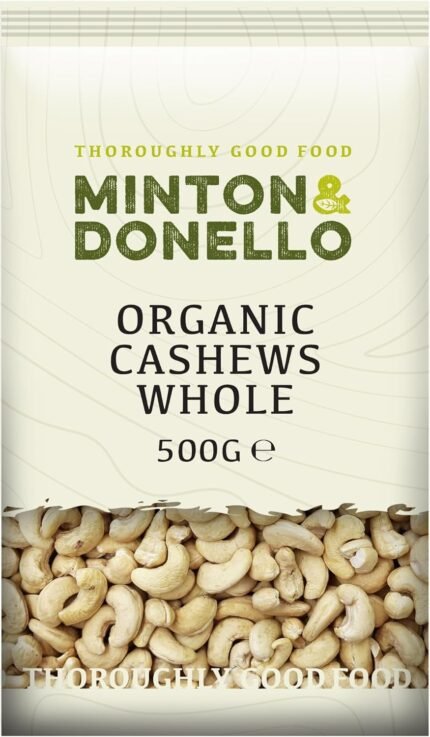 Minton & Donello 500g Organic Raw Whole Cashews – High Fibre, Protein-Rich Snack