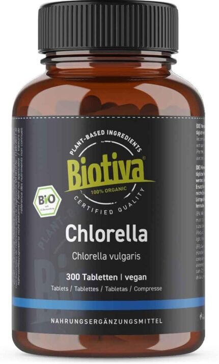 Biotiva Chlorella Tablets Organic high dose (300 Tablets) – 500mg pellets – 100% Pure – Vegan Chlorella Algae pellets – Without Magnesia Stearate – Packed and Controlled in Germany (DE-ECO-005)