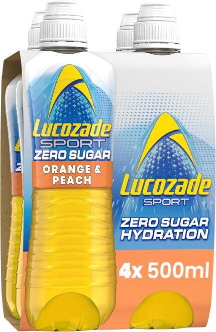 Lucozade Sport Zero Sugar – Orange & Peach 4x500ml | Sugar Free Sports Drink, with Vitamin B3 and electrolyte | Zero Sugar | Only 4 calories per serving | Still | Made with Natural Flavours