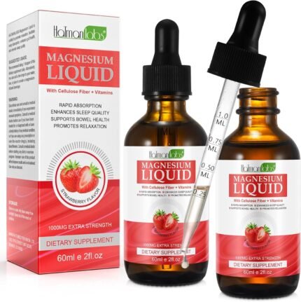 Magnesium Glycinate Drops for Women & Men, Liquid Supplements Complex with MagnesiumTaurate, Cellulose Fiber, Bromelain, Vitamins and Zinc, Strawberry Flavour, 60ml