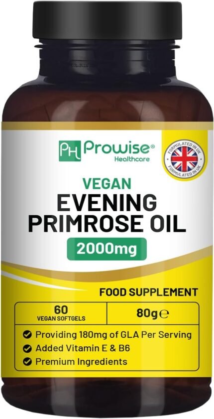 Vegan Evening Primrose Oil 2000mg with Vitamin E & B6 – 60 Vegan Softgels| Pure Cold Pressed I 180mg GLA per Capsule I Women’s Health I Premium Quality I by Prowise Healthcare