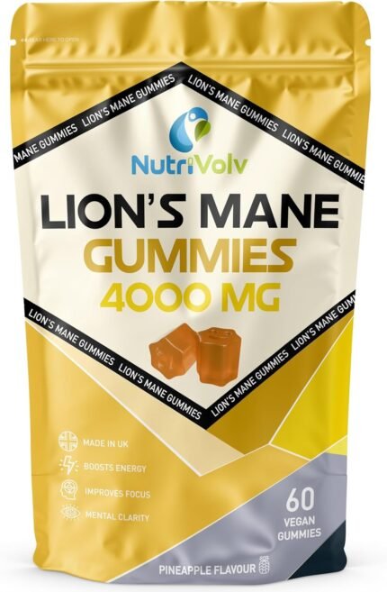 Lions Mane Gummies 4000mg | Super Strength Lion’s Mane Supplement | 1 Month Supply | Mushroom Extract | Pineapple Flavour | 60 Vegan Gummies | Sugar Free | Focus, Mental Performance | by NutriVolv