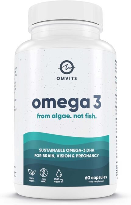 Omvits Vegan Omega 3 DHA from Algae Oil 1000mg – 60 Softgel Capsules with Vitamin E – Sustainable Algal Alternative to Fish Oil – Vegetarian Essential Fatty Acids – Supports Heart, Brain & Eyes