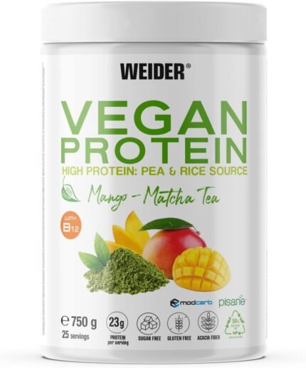 Weider Vegan Protein (750g) Mango-Matcha Flavour. 23g Protein/dose, Pea Isolate (Pisane) & Rice Protein. with Vitamin B12 & Stevia. Gluten Free, Sugar Free. Packaging 50% Recycled 100% Recyclable