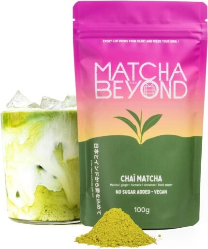 Matcha and Beyond Chai Blend – Matcha with Chai Spices – Gluten Free Vegan Blend with Ginger, Turmeric & Cinnamon – Low Caffeine Japanese Ceremonial Grade Green Tea – Great for Hot & Cold Lattes, 100g