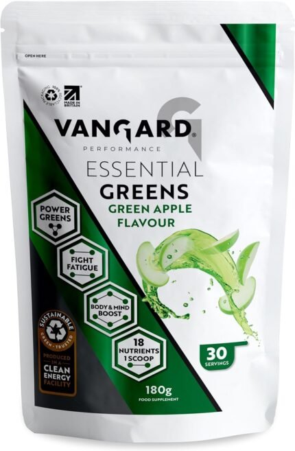 Vangard Essential Greens Green Apple Flavour (180g – 30 Servings), Ashwagandha, Lions Mane and Tumeric to Support Metabolism & Immunity