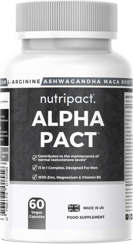 Nutripact Testosterone Support Supplement with Tribulus Terrestris, Ashwagandha, Maca Root, Zinc, Magnesium, L Arginine, Ginseng – Testosterone Supplements for Men – 60 Vegan Capsules – Alpha Pact