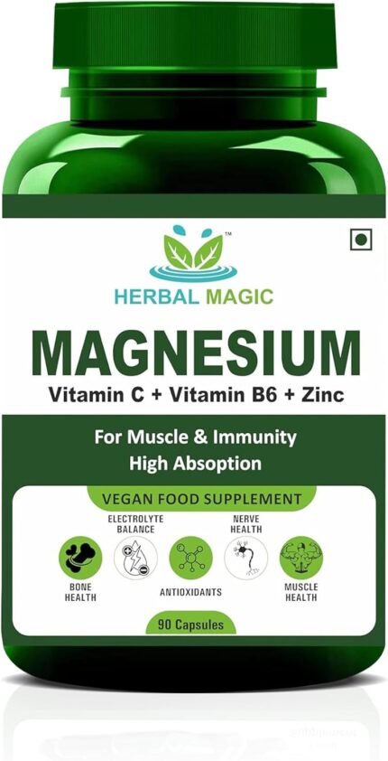 Herbal Magic Magnesium with Vitamin C, B6 & Zinc (90 Capsules) – Vegan Food Supplement for Immunity, Muscle Function & Energy Support