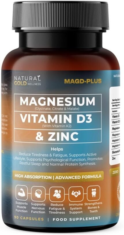Magnesium Glycinate Complex 6-in-1 with Citrate, Malate + Vitamin D3 4000 iu & Vitamin K2 MK7 100μg + Zinc | 1600mg Magnesium Supplement – High Absorption – 90 Vegan Capsules by Natural Gold Wellness