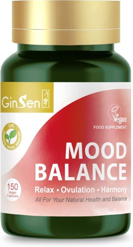 GinSen Strong Mood 150 Capsules, Natural Balance, Ovulation Support & Stress Management, Vegan Approved Supplement, Herbal Extract&Vitamins Made in UK