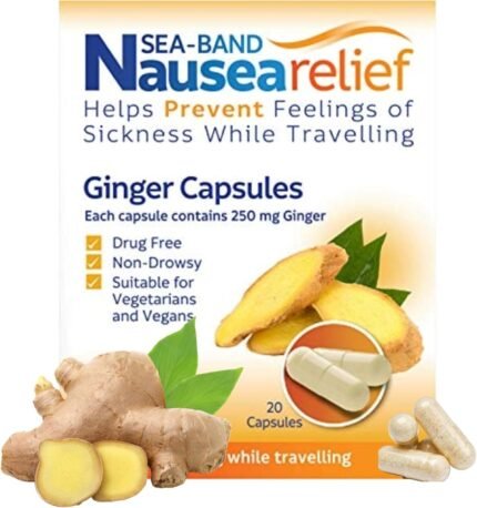 Sea-Band Travel Sickness Ginger Capsules (20 Pack) for Adults and Children Over 12 Years, for Motion and Nausea Relief (20 Capsules, Pack of 1)