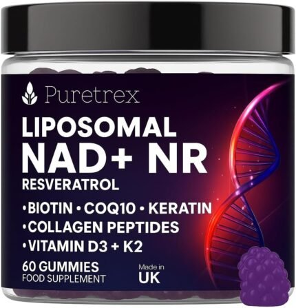 Liposomal NAD+ NR Supplement with Resveratrol, Biotin, CoQ10, Keratin, Collagen Peptides, Vitamin D3 + K2, 60 NAD Gummies for Women Made in The UK