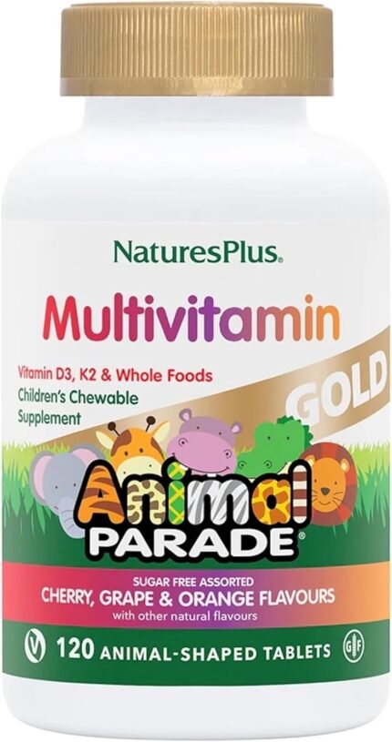 NaturesPlus Animal Parade Gold Children’s Multivitamin – Animal Shaped Chewable Multi for Kids – Assorted Flavours – Vegan, Gluten Free – 120 Chewable Tablets