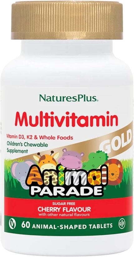 NaturesPlus Animal Parade Gold Kids’ Multivitamin Natural Cherry Flavour – Chewable Vitamins, Superfoods and Probiotics – Vegan, Gluten Free – 60 Animal Shaped Chewable Tablets