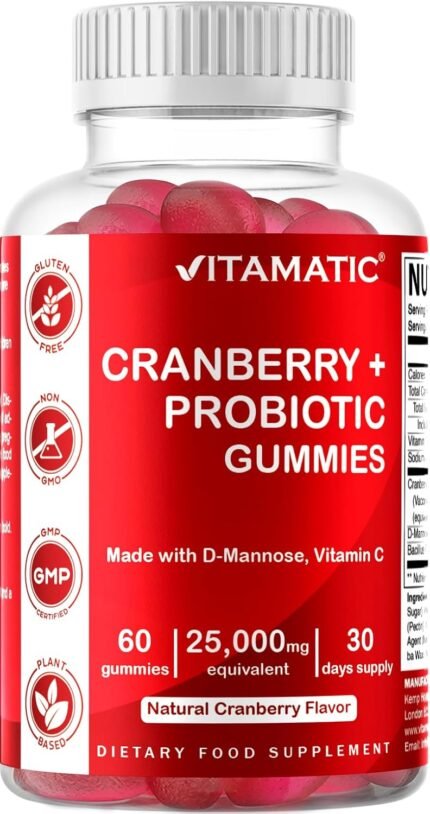 Vitamatic Vegan Cranberry Gummies with D-Mannose, Probiotic & Vitamin C for Women Urinary Tract Health – 25000 mg Equivalent per Serving – 60 Count – (Non-GMO, Gluten Free)