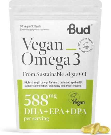 Vegan Omega 3 Supplements – High-Strength DHA EPA & DPA – Premium Plant-Based Algae Oil Omega 3 – Omega Supports Brain, Eye & Heart Health – 60 Omega 3 Vegan Capsules (1 Month Supply)
