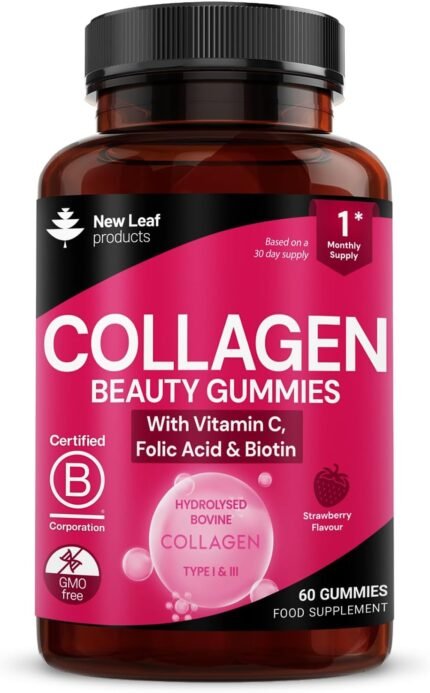 Collagen Gummies – High Strength Type l Bovine Collagan Beauty Supplement – Advanced Superior Type 1 Hydrolysed Collagen Peptides – Added Biotin, Vitamin C & Folic – 60 Gummies