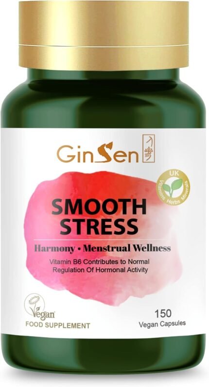 GinSen Smooth Stress, Stress Relief Supplement, Period Emotional Balance, Herbal Extract & Vitamins Made in UK (150 Capsules)