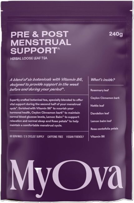 MyOva Pre & Post Menstrual Support Tea – Period Pain Relief Tea – Hormone Balance with Rosemary Leaf – Lemon Balm for Bloating Relief – Vegan & Organic – 240g, 60 Servings, 30 Days Supply