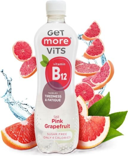 Get More Vits – B12 Vitamins Still Pink Grapefruit Flavoured Spring Water (12 x 500ml), Supports Energy Release, Tackle Tiredness & Fatigue, Natural Flavours, Sugar Free, Low Calorie, Vegan