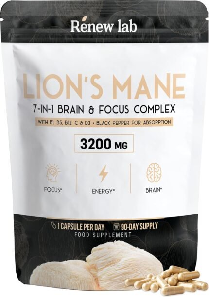 Lions Mane Capsules 3200mg (90 Servings) 7 in 1 Complex for Brain & Immune with Lion’s Mane Mushroom Extract, B Complex B1, B5, B12, Vitamin C, D3 & 95% Piperine – 1 Capsule a Day Vegan High Strength
